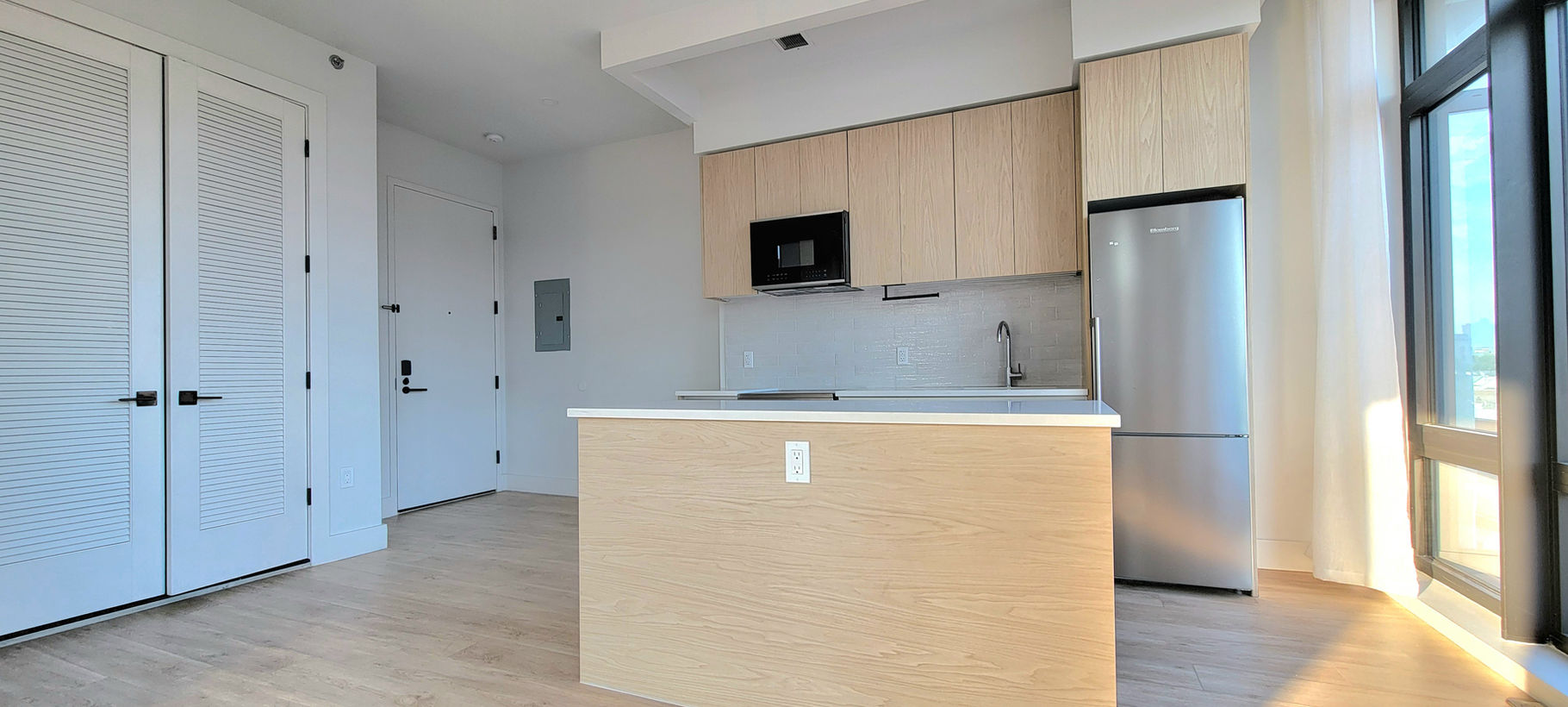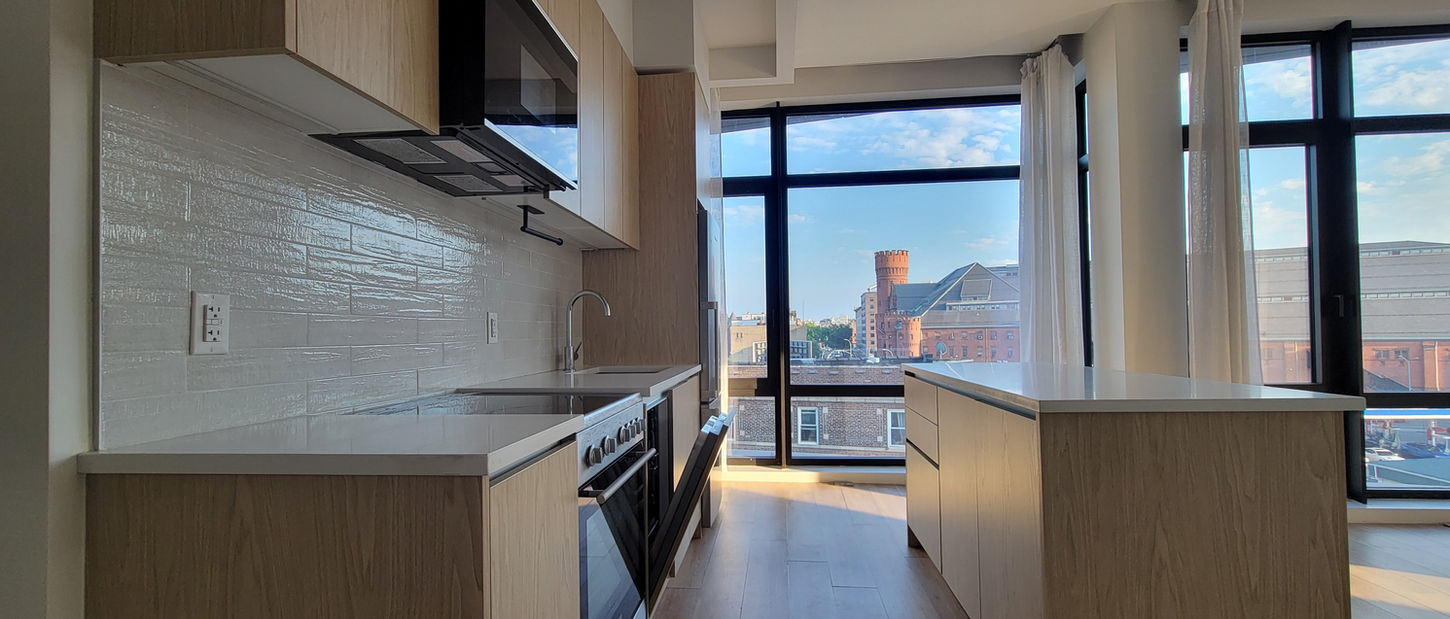 Indulge in high-end details, such as custom floor-to-ceiling windows, 9.5 feet tall ceilings, contemporary light fixtures, lacquer kitchen cabinets, pure white quartz countertops, a fully integrated dishwasher, and stainless steel appliances. Bathrooms are equipped with high efficiency toilets, oversized wall mirror, and easy-to-maintain porcelain tiles.